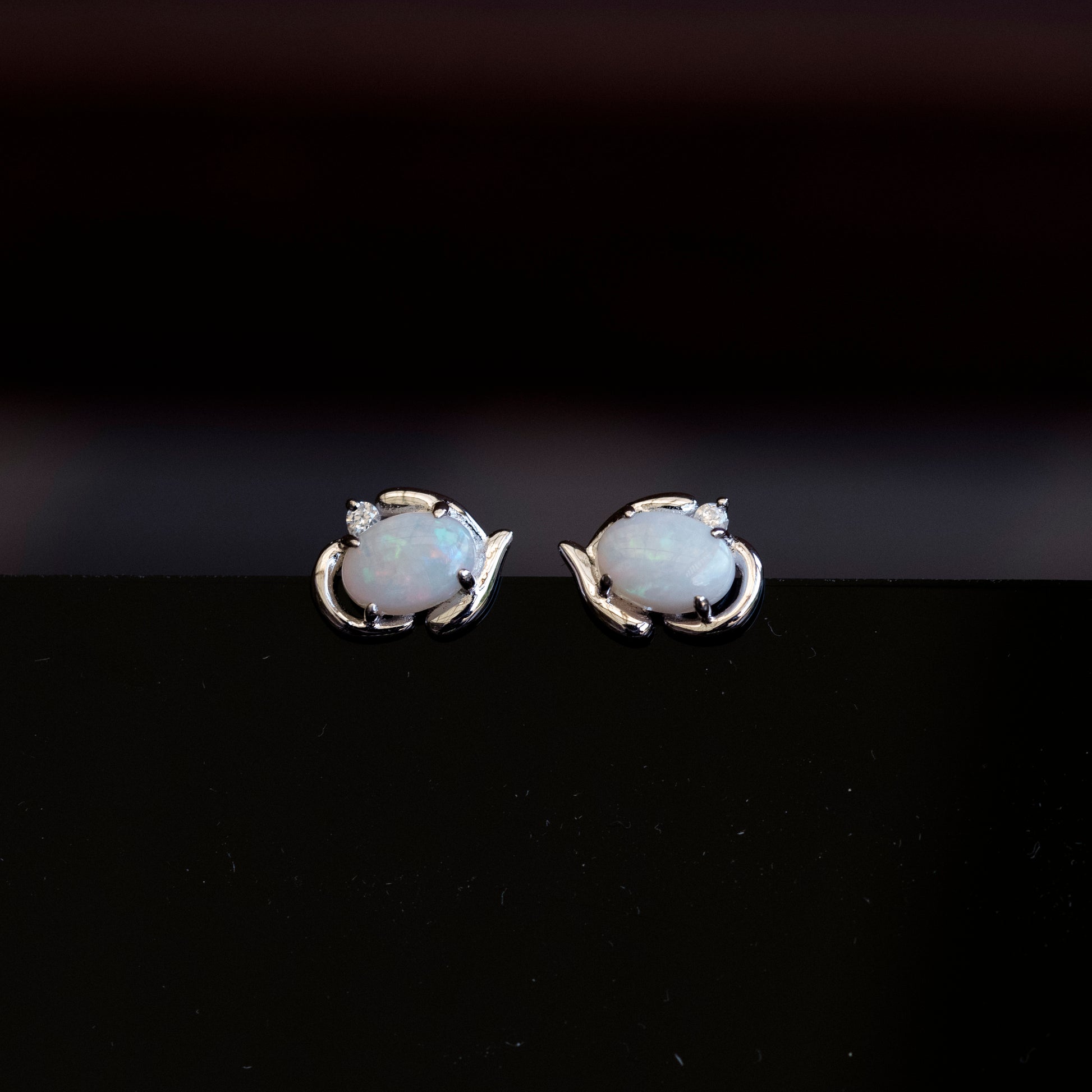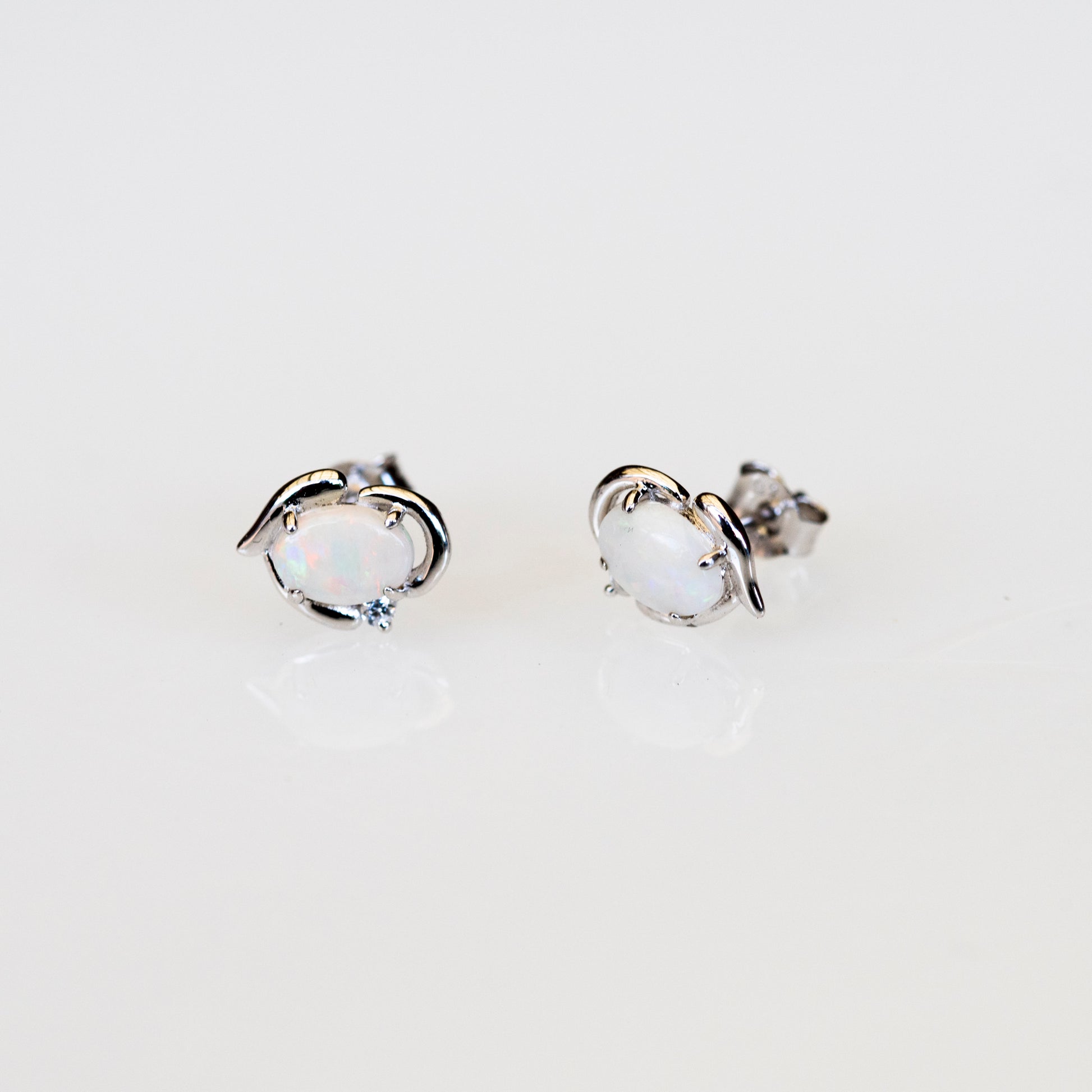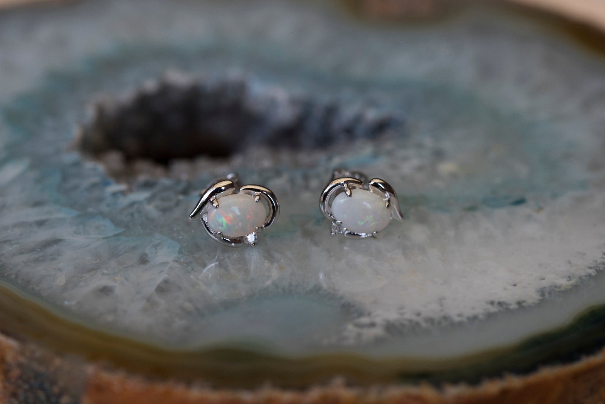 Shop authentic Australian white opal earrings with natural multicolour play-of-colour. Each opal is ethically sourced from Coober Pedy and handcrafted in sterling silver with white gold plating. No two opals are alike, making each pair a one-of-a-kind treasure.